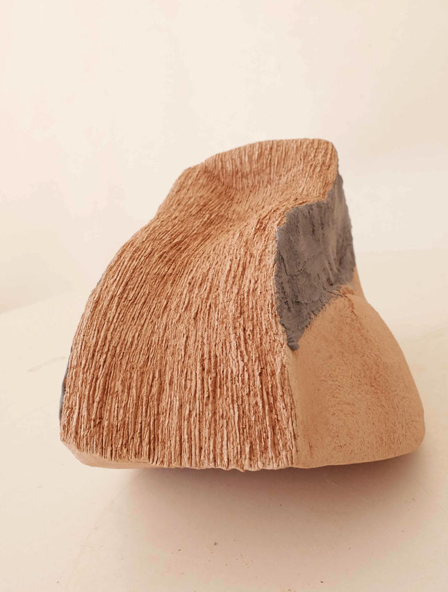 Ces céramiques sont des pièces uniques, réalisées en grès ou en faïence. La cuisson est effectuée dans un four à gaz ou directement dans le feu de la forge à charbon de bois, pour un rendu plus tellurique. Ces pièces ne sont pas émaillées, et ce afin de mettre en avant le caractère minéral de la céramique brute.